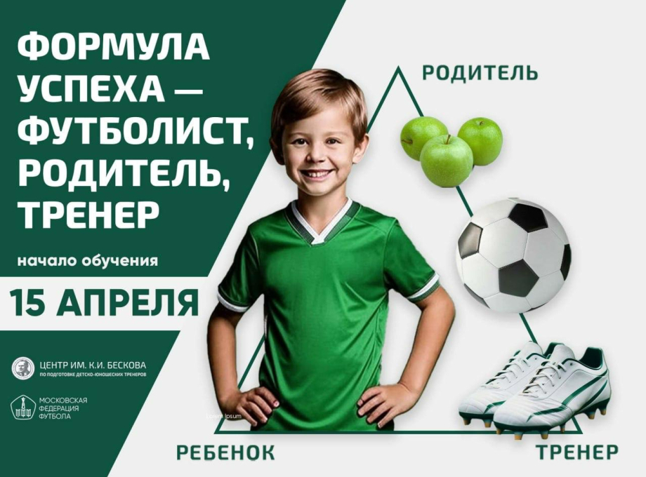 В Центре подготовки специалистов в сфере футбола имени К.И. Бескова 15 апреля стартует новая образовательная программа «Формула успеха - футболист, родитель, тренер». Курс разработан специально для родителей, чьи дети занимаются футболом, и поможет разобраться в ключевых аспектах спортивного воспитания – от психологии до медицинских вопросов.