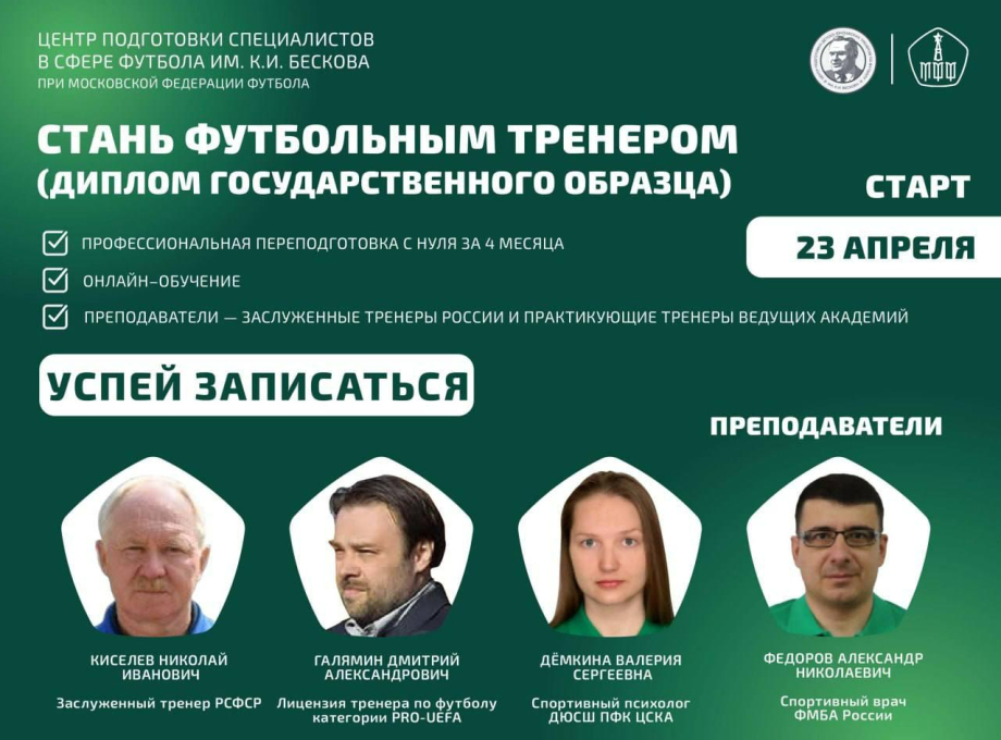 Московская федерация футбола совместно с Центром подготовки специалистов в сфере футбола имени К.И. Бескова продолжает набор на обучение по программе профессиональной переподготовки «Тренер-преподаватель по футболу» с выдачей диплома государственного образца.